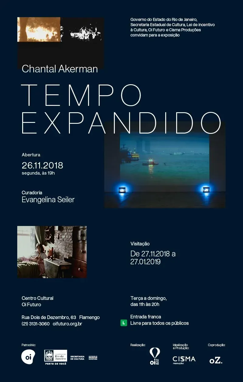 Chantal Akerman – Tempo Expandido é uma mostra inédita, que conta com a curadoria de Evangelina Seiler e tem sua montagem supervisionada por Claire Atherton, uma das colaboradoras mais próximas de Akerman. O objetivo é aproximar o público brasileiro da estética, do estilo e sobretudo da visão particular da artista sobre o universo feminino. Beto Amaral, da Cisma, idealizou a exposição em 2014, em parceria com a galeria Marian Goodman. Daniela Thomas e Felipe Tassara assinam a expografia da mostra.