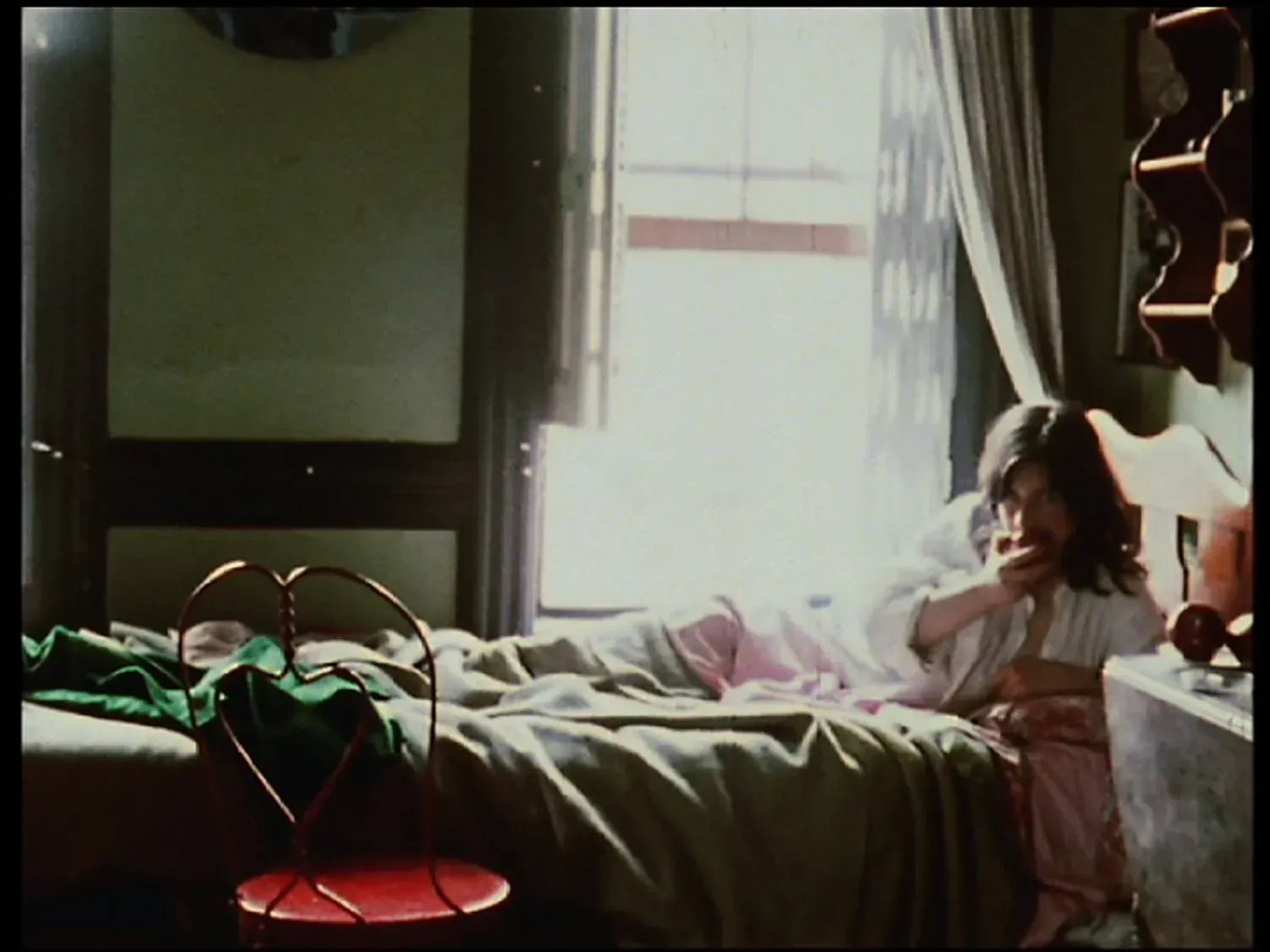 La Chambre (2012) foi criada a partir de imagens do filme homônimo de 16mm, lançado em 1972. No artigo “Chantal Akerman: autorretrato da cineasta”, de 2004, a revista Cahiers du Cinéma, editada pelo Centre Pompidou, resume assim o filme: “Uma longa e lenta panorâmica descreve repetitiva e continuamente o espaço de um quarto. No leito, Chantal Akerman – primeiro sentada e imóvel e, quando a câmera retorna, comendo uma maçã. Trata-se tanto de um autorretrato misterioso da cineasta em seu lugar previsível, quanto o equivalente, para o seu cinema, a uma natureza morta: reunir seus motivos pessoais em uma descrição repetitiva para melhor descartá-los em seguida.”